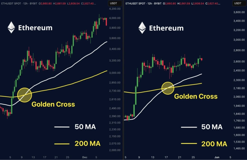 Un conocido trader ha identificado una configuración prometedora para Ethereum con la aparición de una cruz dorada en el gráfico de 12 horas.