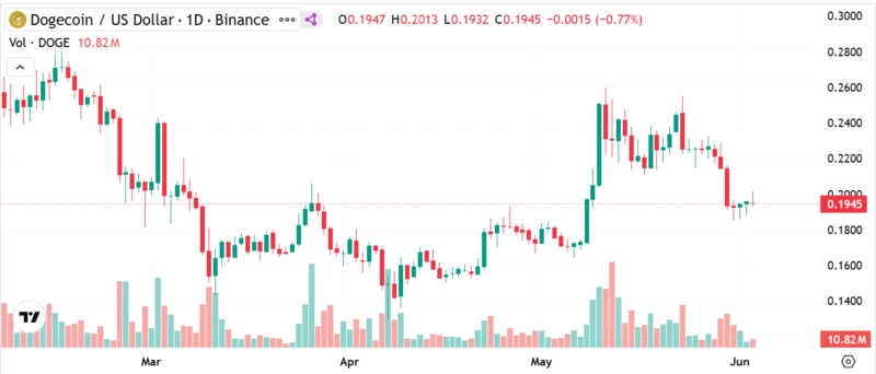 - El DOGE subió un 5,75 %, pasando de 0,191 $ a 0,200 $ en 24 horas.
