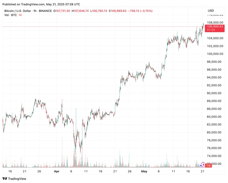 El bitcoin ha alcanzado recientemente un nuevo máximo de alrededor de 108 000 dólares a fecha de 21 de mayo de 2025, lo que supone un momento clave en su actual repunte. A diferencia de las subidas bruscas e impredecibles, este aumento refleja un movimiento alcista bien organizado y constante impulsado por la fortaleza real del mercado.