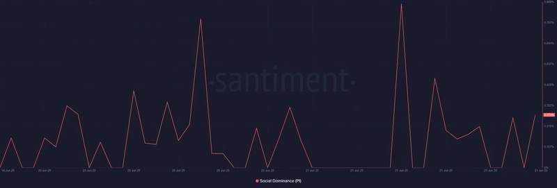 Dada la escasez de datos en cadena debido al cierre parcial de la red principal de Pi Network, las métricas sociales se han convertido en un indicador clave del sentimiento. El dominio social de Pi Coin experimentó picos significativos entre el 19 y el 21 de junio, alcanzando un 0,85 % en su punto álgido, probablemente impulsado por la expectación ante el Pi2Day. Estas explosiones en las discusiones sociales indican un creciente optimismo especulativo, aunque no siempre son consistentes.