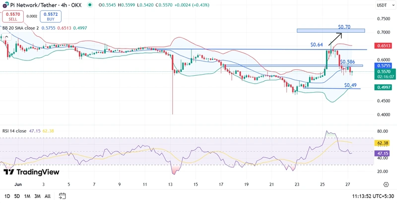 Pi alcanzó un mínimo diario de 0,5453 $ y un máximo de 0,6104 $, lo que indica un amplio rango intradía. Pi Coin se enfrenta a una resistencia en 0,64 $, y una ruptura exitosa podría empujarla hacia los 0,70 $. Sin embargo, si no logra mantenerse por encima de 0,50 $, podría caer hasta 0,49 $.