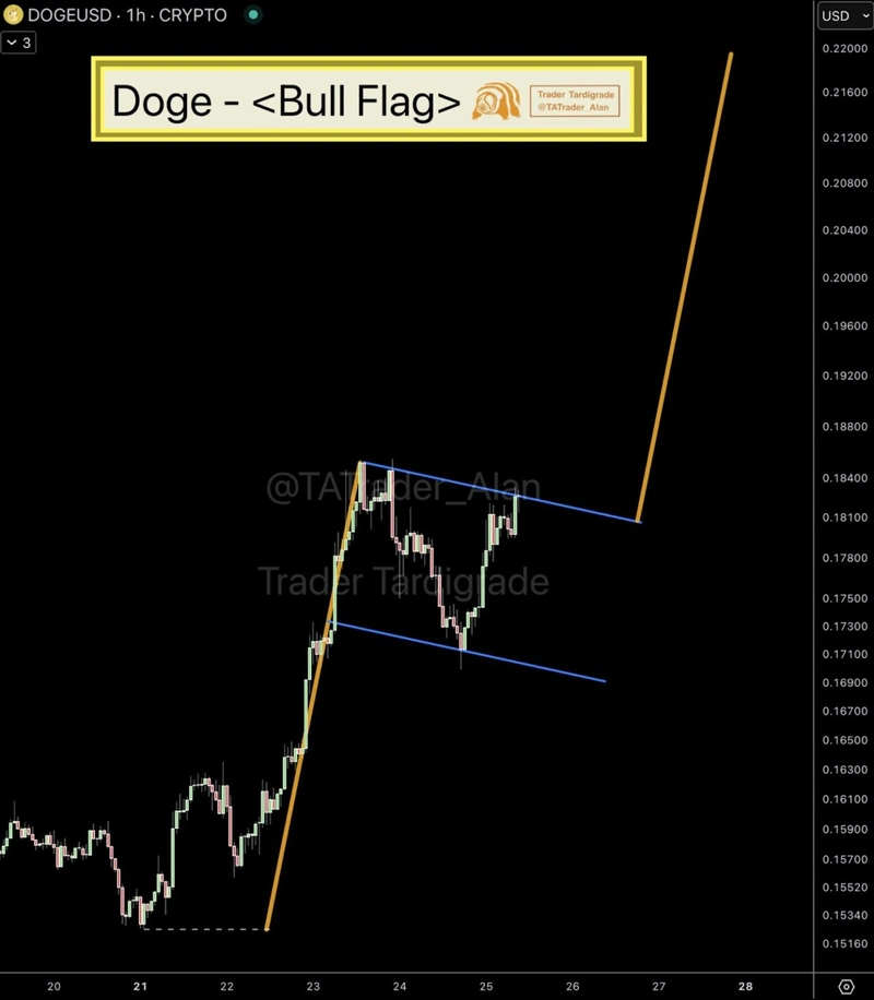 En el momento de la observación, Dogecoin estaba probando el límite superior de este patrón de bandera, situado entre 0,1810 y 0,1840 dólares. Si el precio supera este nivel de resistencia, se confirmaría el patrón de bandera alcista, lo que podría impulsar el precio hasta 0,22 dólares. Este objetivo se basa en la altura del mástil y la distancia de ruptura prevista.