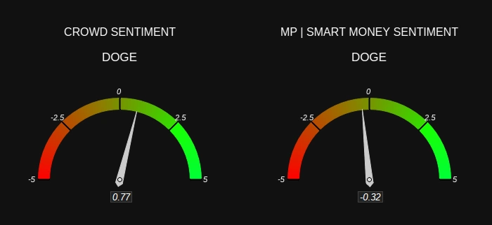 El sentimiento en torno a Dogecoin es muy positivo, con el revuelo en las redes sociales y el creciente interés del público impulsando los indicadores de sentimiento hasta un valor de 0,77. Esto indica un fuerte optimismo entre los inversores minoristas. Sin embargo, el sentimiento del «dinero inteligente», que representa a los operadores institucionales y experimentados, muestra más cautela, con una lectura de -0,32. Esta divergencia entre el entusiasmo del público en general y la perspectiva más conservadora de los traders expertos sugiere que podrían producirse movimientos significativos en los precios, especialmente durante los periodos de volatilidad del mercado.
