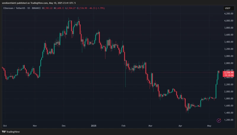 Ethereum se mantiene fuerte gracias a las recientes ganancias, alcanzando un máximo de 2600 dólares la semana pasada tras una subida del 37 %. Este aumento se produce tras el lanzamiento de la actualización Petra, una importante actualización de la red destinada a mejorar la eficiencia de Ethereum aumentando su tasa de quema y reduciendo la oferta en circulación. Si bien el movimiento del precio en sí mismo es impresionante, los analistas señalan algo aún más significativo: Ethereum se cotiza ahora por encima de su precio realizado, una señal clave de la fortaleza alcista a largo plazo.