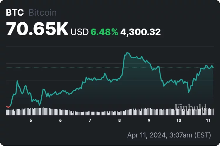 En el momento de redactar este informe, el valor de Bitcoin se situaba en 70.650 dólares, lo que supone un aumento del 2,63% en el día y del 6,48% en la semana anterior, a pesar de un ligero descenso del 1,36% en el mes, según los últimos datos disponibles a 11 de abril.