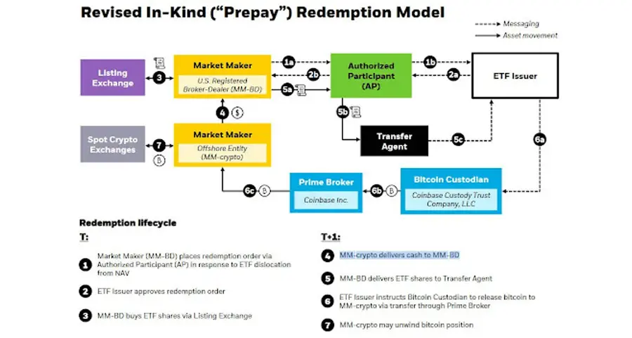 BlackRock especifica que, bajo el nuevo marco, los Participantes Autorizados (PA) transferirían efectivo a un agente de bolsa, que lo convertiría en Bitcoin y lo almacenaría de forma segura con el custodio del ETF, Coinbase Custody.