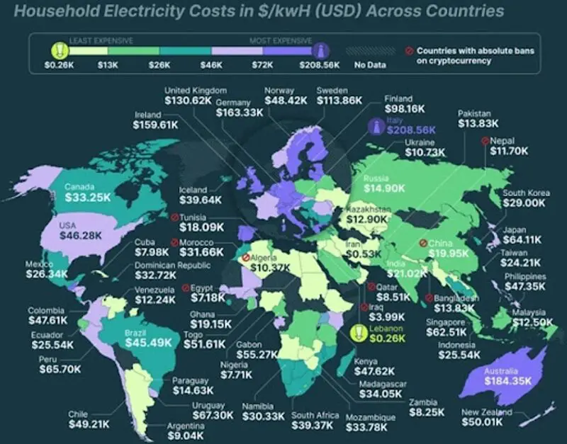 Para los mineros de Bitcoin, la reducción a la mitad en 2024 plantea retos significativos. Con las recompensas reducidas a la mitad, los mineros que utilizan equipos anticuados y se enfrentan a costes de electricidad exorbitantes se encuentran en una posición precaria. En algunas regiones como Italia, el coste de minar un solo Bitcoin puede rivalizar con el de los coches deportivos de lujo, alcanzando los 208.560 dólares.