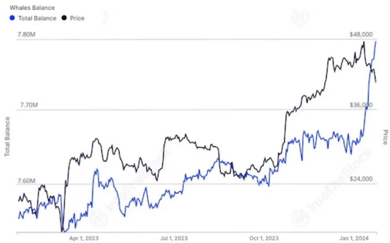 «Mientras que los ETF de bitcoin han visto entradas netas de $820M, las ballenas de bitcoin han visto un aumento de ~$3B (76,000 BTC) en lo que va de 2024», dijo IntoTheBlock en un boletín semanal. «Las ballenas incluyen cualquier entidad, individuo o fondo (incluidos los ETF) que posean más de 1,000 BTC».