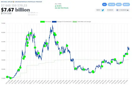 Bitcoin cotiza a 43.809 dólares en el momento de escribir estas líneas, y MicroStrategy muestra un beneficio no realizado de la asombrosa cifra de 2.330 millones de dólares. La empresa posee 174.530 BTC.