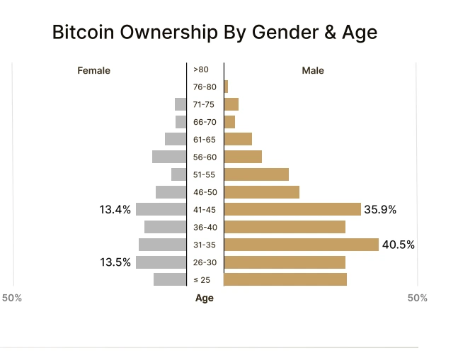La propiedad de bitcoins traspasa las fronteras sociales y políticas, con pocas variaciones en función de la raza, la religión, los ingresos o la afiliación política. Sin embargo, es notablemente más popular entre los hombres y los adultos jóvenes. El grupo más numeroso de propietarios de bitcoins son los hombres de entre 31 y 35 años, que representan el 40,5 % de los titulares, seguidos de los hombres de entre 41 y 45 años, con un 35,9 %. Las mujeres representan solo el 13,4 % de los propietarios, lo que pone de relieve una importante brecha de género en la adopción de las criptomonedas.