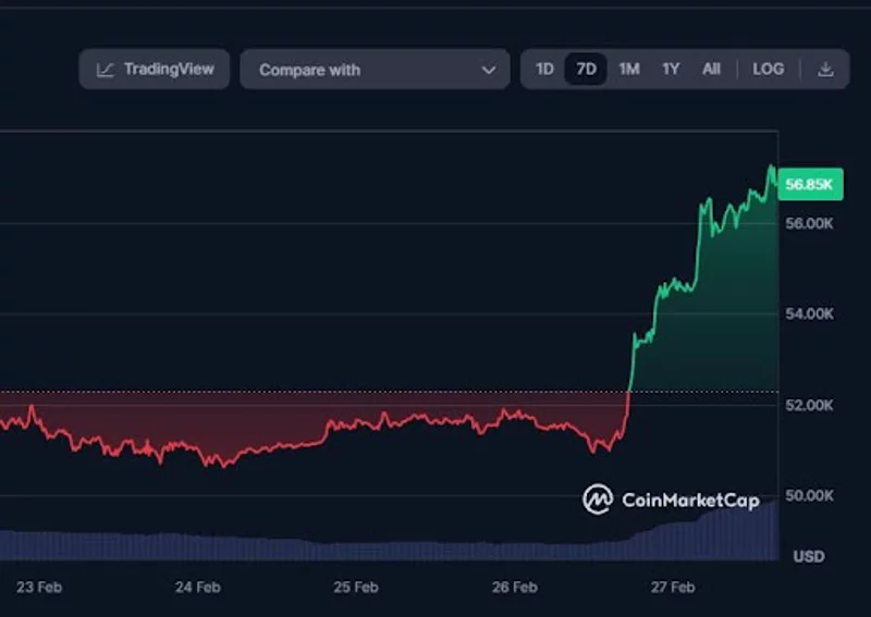 Bitcoin cotiza actualmente a 56.850 dólares. En las últimas 24 horas, el precio de Bitcoin se ha revalorizado más de un 10%, con lo que sus ganancias en lo que va de año rondan el 34%.