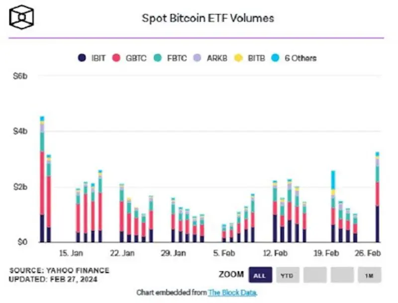 Además, los nueve ETF recién nacidos establecieron ayer un nuevo récord de volumen diario, con un volumen de negociación que alcanzó los 2.400 millones de dólares, encabezado por el ETF de BlackRock que superó la marca de los 1.000 millones de dólares, superando el anterior récord diario establecido el primer día de negociación de los instrumentos.
