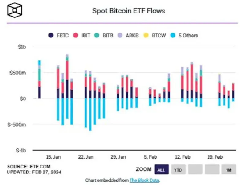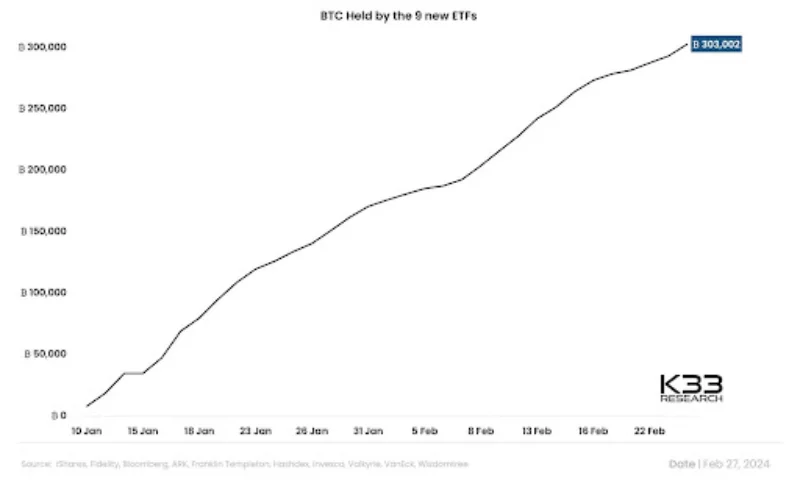 Datos recientes de K33 Research revelan que estos nueve ETF han acumulado colectivamente 303.002 BTC, valorados en aproximadamente 17.000 millones de dólares según las cifras de cierre de ayer. Lanzados el 11 de enero, esta cohorte de ETF incluye entidades de renombre como BlackRock (IBIT), Fidelity (FBTC), Bitwise (BITB), Ark Invest 21Shares (ARKB), Invesco (BTCO), VanEck (HODL), Valkyrie (BRRR), Franklin Templeton (EZBC) y WisdomTree (BTCW), lo que representa una diversa gama de actores que entran en el ámbito de la inversión en bitcoin.