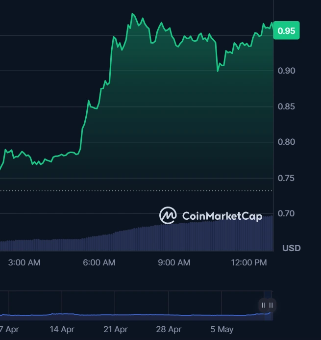 El entusiasmo no ha pasado desapercibido en los mercados. En solo 24 horas, el precio de PI se disparó un 30 %, situándose justo por debajo de la marca de 1 dólar, en 0,96 dólares. El volumen de operaciones también se disparó, aumentando más del 160 % a medida que cobraba impulso el impulso en todo el espacio criptográfico.