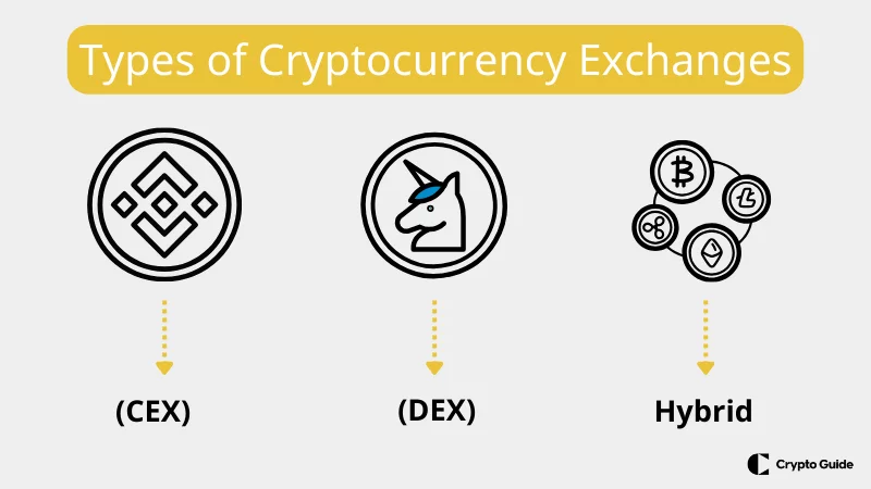 Una única entidad posee intercambios centralizados (CEX) y permite el comercio de cripto. Los Intercambios Descentralizados (DEXs) son peer-to-peer, facilitando las transacciones directas de los usuarios sin intermediarios. Los intercambios híbridos combinan la eficiencia de los CEX con la seguridad y privacidad de los DEX.