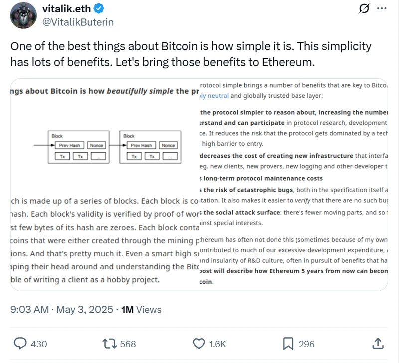 Vitalik Buterin, cofundador de Ethereum, ha propuesto un reinicio de la plataforma con el objetivo de simplificar el protocolo de Ethereum para que sea tan sencillo como el de Bitcoin en un plazo de cinco años. En una entrada de blog fechada el 3 de mayo de 2025 y titulada «Simplifying the L1» (Simplificando el L1), Buterin destacó la importancia de la simplicidad y citó el elegante y sencillo protocolo de Bitcoin como factor clave de su confianza y credibilidad a nivel mundial.